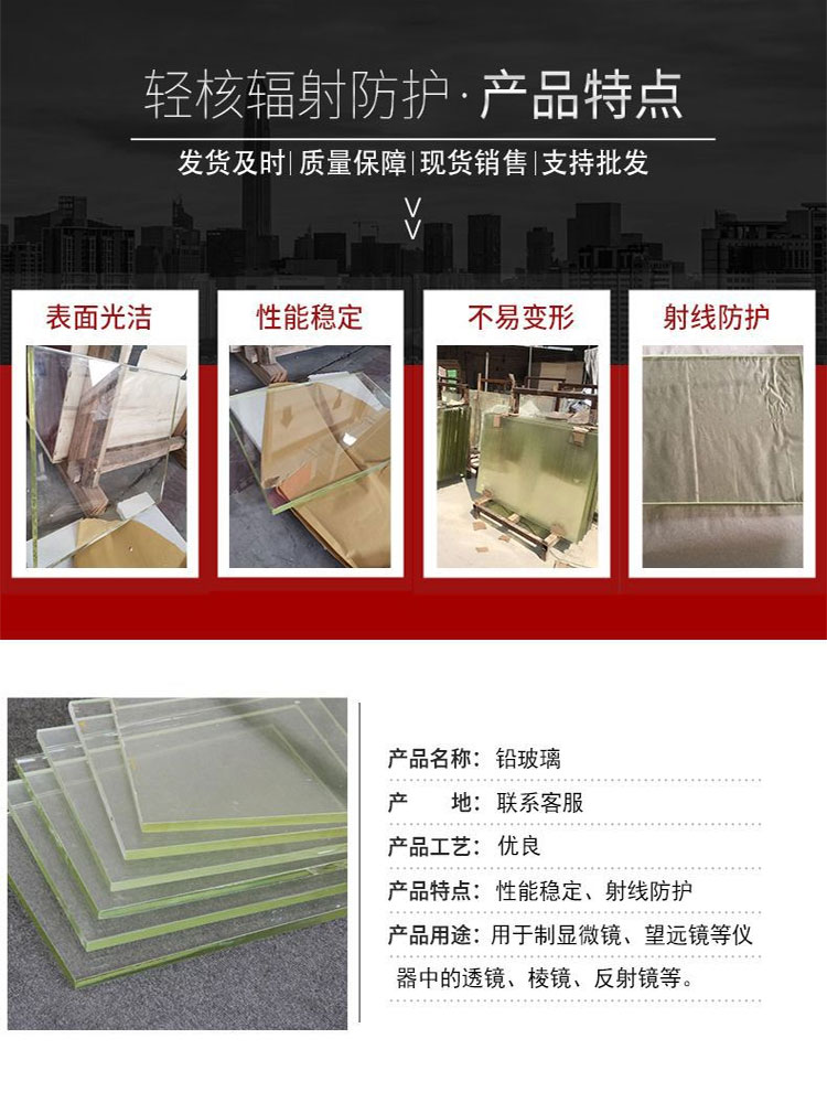 2、进口铅玻璃:现在我们国内的普瑞泰进口铅玻璃多数都是从国外进口的原材料,在国内进行加工,进口铅玻璃的生产工序十分的严谨考究,所以生产出来的铅玻璃上面没有任何的杂质、也没有气泡;进口铅玻璃的颜色发黄,相对国产的铅玻璃要黄一些;主要也用于各大医院的口腔科、X光室、CT室、DR室;用来做观察窗口。常用的规格有与国产铅玻璃规格基本相同。