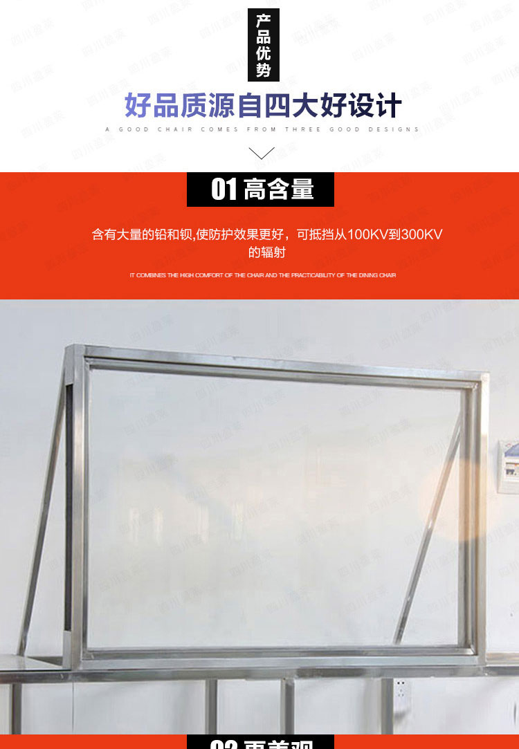 1、国产铅玻璃:国产铅玻璃顾名思义就是我们国内生产加工的铅玻璃,由于国内的加工技术还不够完善,加工出来的铅玻璃大不分都会多多少少有一些气泡,这个是暂时避免不了的,但是并不影响玻璃的使用。主要用于各大医院的口腔科、X光室、CT室、DR室;用来做观察窗口,常用的规格有300*400、400*600、600*800、600*900、800*1000、800*1200、900*1200、900*1500、1000*1200、1000*1500、1000*1800、1000*2000、1200*1500、1200*1800、1200*2000、1200*2400;厚度主要有:10mm、12mm、15mm、18mm、20mm、25mm、40mm、50mm、80mm、100mm等;厚度越厚铅当量也就越高。